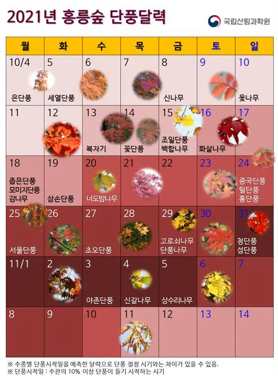 국립산림과학원은 2007년부터 서울 홍릉숲 내 단풍이 드는 주용 수종(단풍나무, 복자기, 신갈나무 등 30여 개 수종)의 단풍 시작일과 단풍 기간을 관측해왔으며, 이를 바탕으로 매년 가을철에 수종별 단풍 시작일을 예측하여 발표하고 있다고 합니다.