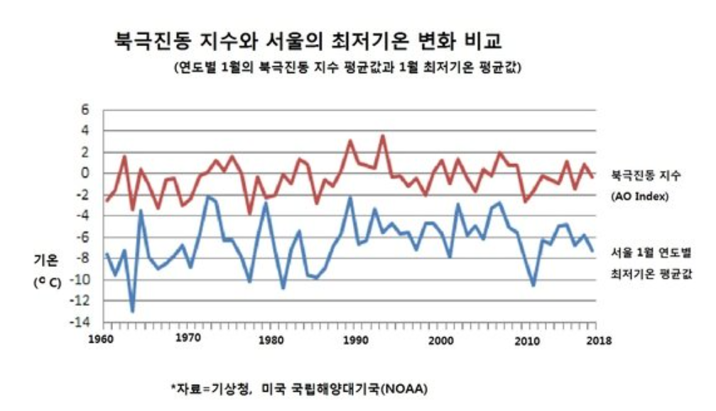 미국 국립해양대기국(NOAA)에서 제공하는 1960년 이후 연도별 1월의 북극진동 지수 평균값과 기상청의 1월 서울의 최저기온 평균값을 비교한 결과, 1월의 북극진동 지수가 음수(-)일 때는 1월 최저기온이 낮아지고, 지수가 양수(+)일 때는 최저기온이 올라가는 경향을 보였다고 합니다.