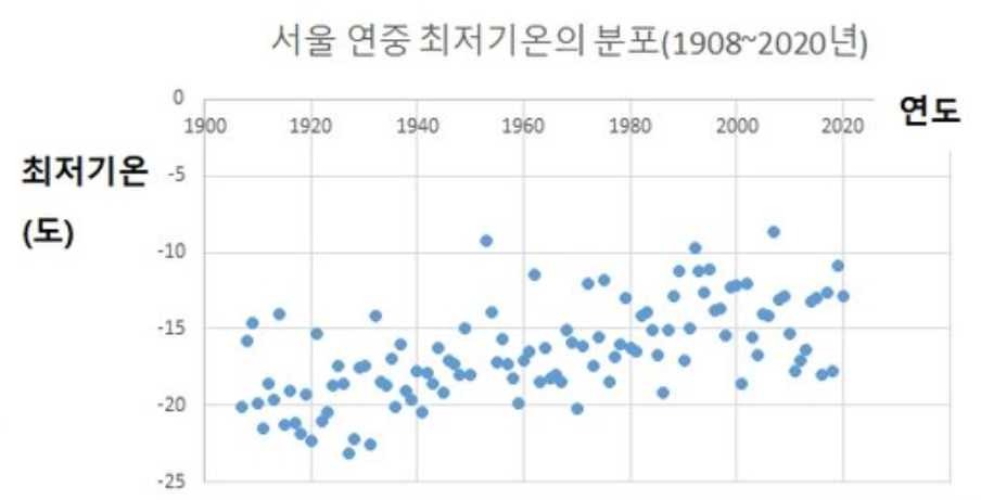 1908~1930년 사이 30년 동안에는 서울의 1월 최저기온 평균이 영하 -9.4도였고, 1931~1960년에는 -9.3도로 비슷했다고 합니다. 하지만, 1961~1990년에는 -7.1도, 1991~2020년에는 -5.5도로 상승했다고 합니다.