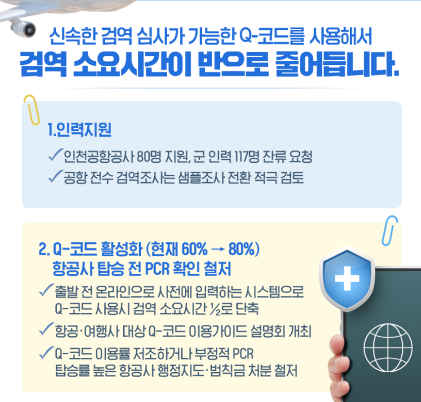 승객들이 신속히 입국할 수 있도록 질서유지 인력을 지원하고, 신속한 검역 심사가 가능한 Q-코드를 사용해서 검역 소요시간이 반으로 줄어듭니다.