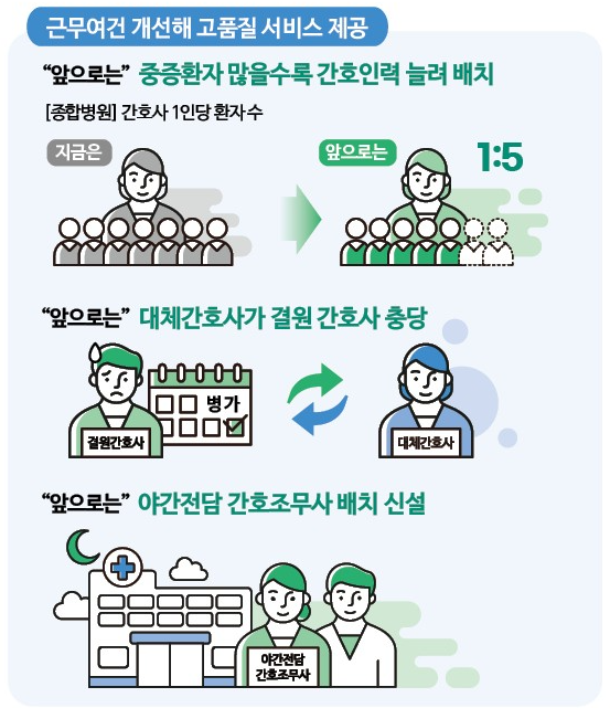 또한, 간호사 병가 등으로 발병하는 긴급한 결원 인력을 대신해 근무하는 '대체 간호사'를 2개 병동당 1명을 지원하며, 야간에만 전담하여 근무하는 간호조무사도 배치합니다.