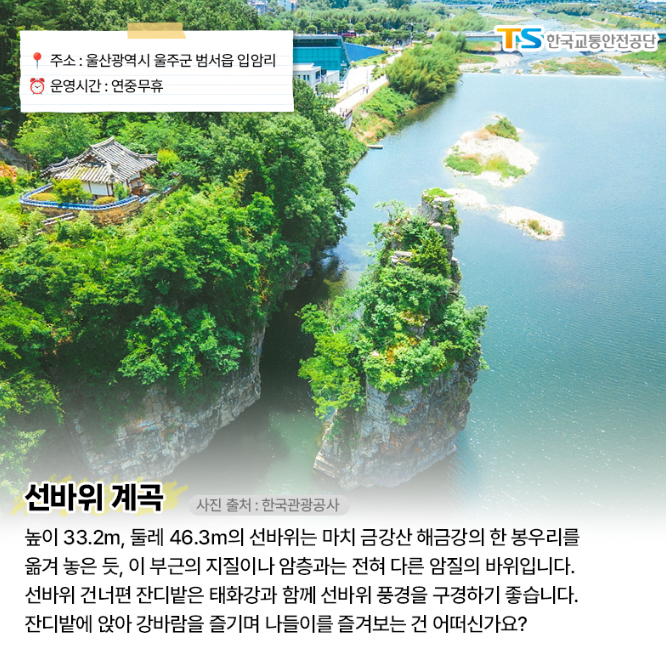 선바위 건너편 잔디밭은 태화강과 함께 선바위 풍경을 구경하기 좋습니다. 잔디밭에 앉아 강바람을 즐기며 나들이를 즐겨보는 것도 좋을 것 같습니다.