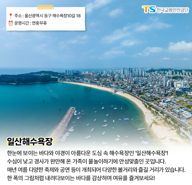 한눈에 보이는 바다와 야경이 아름다운 도심 속 해수욕장인 '일산해수욕장!' 수심이 낮고 경사가 완만해 온 가족이 물놀이를 하기에 안성맞춤인 곳입니다.