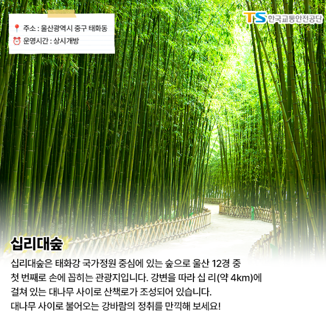 십리대숲은 태화강 국가정원 중심에 있는 숲으로 울산 12경 중 첫 번째로 손에 꼽히는 관광지입니다.