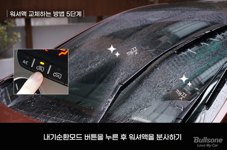 워셔액을 주입했다면, 엔진룸을 닫습니다. 그 후 시동을 켜서 '내부순환모드' 버튼을 누른 후 워셔액을 분사해줍니다. 특유의 에탄올 워셔액 냄새가 외부 공기와 함께 자동차 실내로 들어오는 것을 막을 수 있습니다.