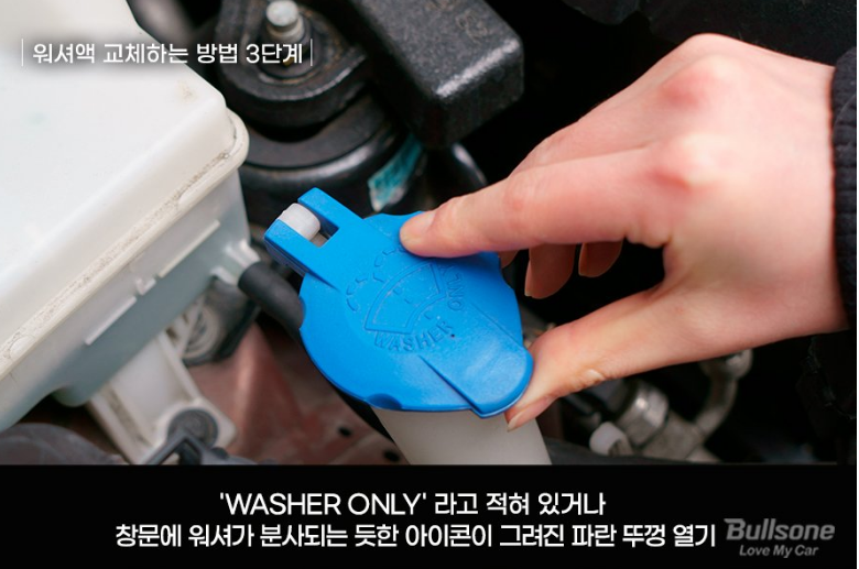 엔진룸에서 'WASHER ONLY'라고 적혀 있거나 창문에 워셔가 분사되는 듯한 아이콘이 그려진 파란 뚜껑을 찾아줍니다. 그게 바로 워셔액 주입구입니다.