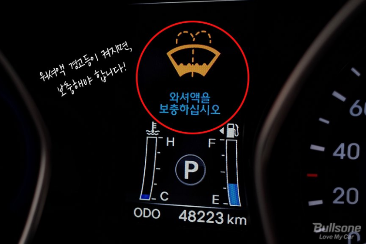 엔진룸을 열어서 워셔액 잔여량을 육안으로 확인할 수도 있고, 워셔액 경고등을 통해 부족하다는 것을 알 수도 있습니다. 보충할 때는 기존 워셔액을 모두 사용한 다음에 새로운 제품을 주입해야 한다고 합니다.