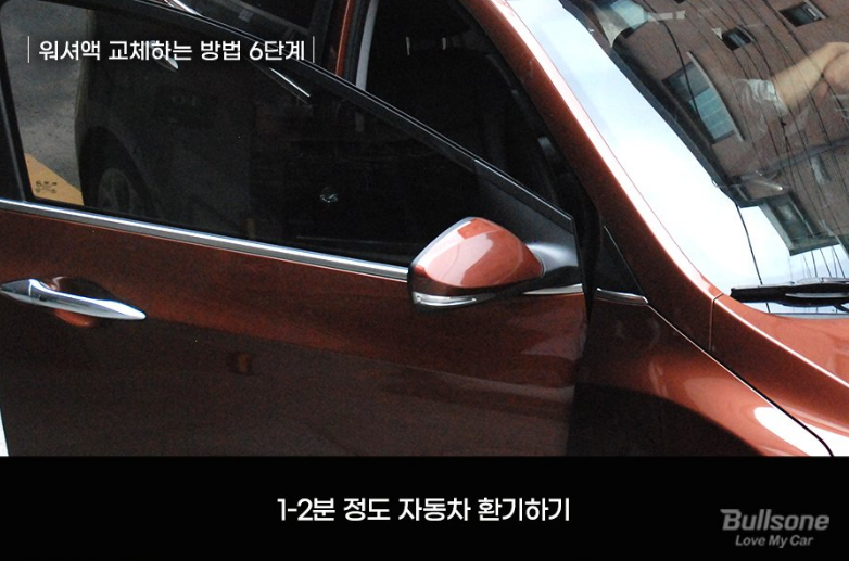 어느 정도 워셔액을 분사했다면, 에탄올 냄새가 날 수 있으니 문을 열어 1~2분 정도 환기해줍니다.