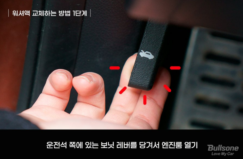 제일 먼저 보닛 레버를 당겨서 엔진룸을 열어줍니다. 갓 주행을 마친 차는 엔진룸이 뜨겁습니다. 시동을 끄고 충분히 기다린 후 엔진룸이 식으면 열어야 합니다.