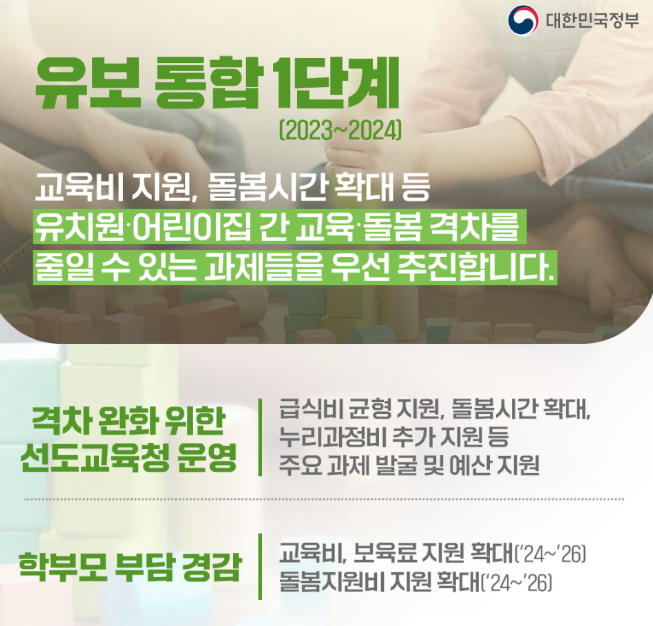 정부가 영유아 중심의 질 높고 새로운 교육·돌봄 체계를 마련하기 위해 유보통합을 본격 추진, 교육 중심의 관리체계 통합으로 생애 초기부터 책임교육의 기반을 마련합니다.