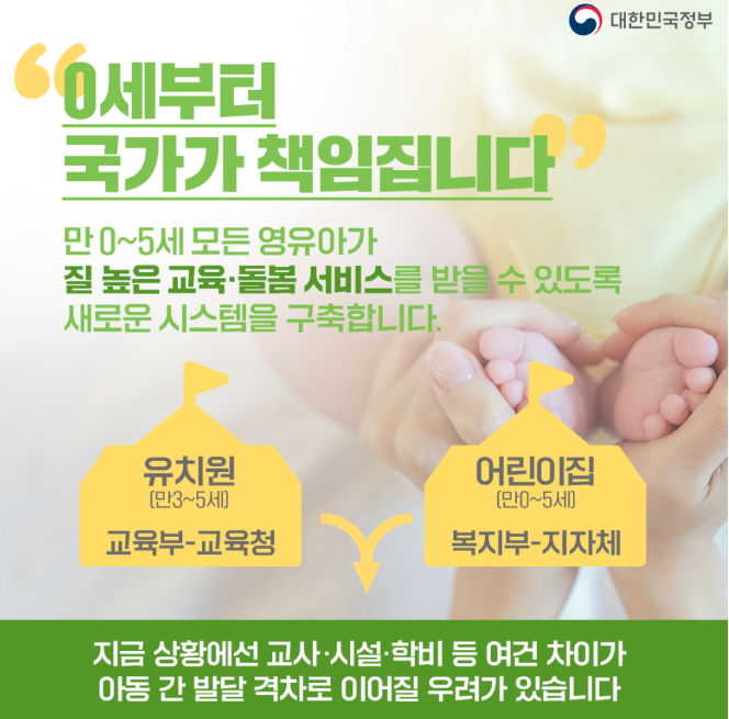 정부는 0~5세의 모든 영유아가 이용 기관에 관계없이 양질의 교육·돌봄 서비스를 차별 없이 받을 수 있도록 유보통합을 통해 새로운 교육·돌봄 시스템을 구축합니다. 초등 늘봄학교와 연계해 0~세부터 11세까지 '국가가 책임지고 국민이 안심하는 는' 책임 교육·돌봄 체계를 완성하기로 했습니다.