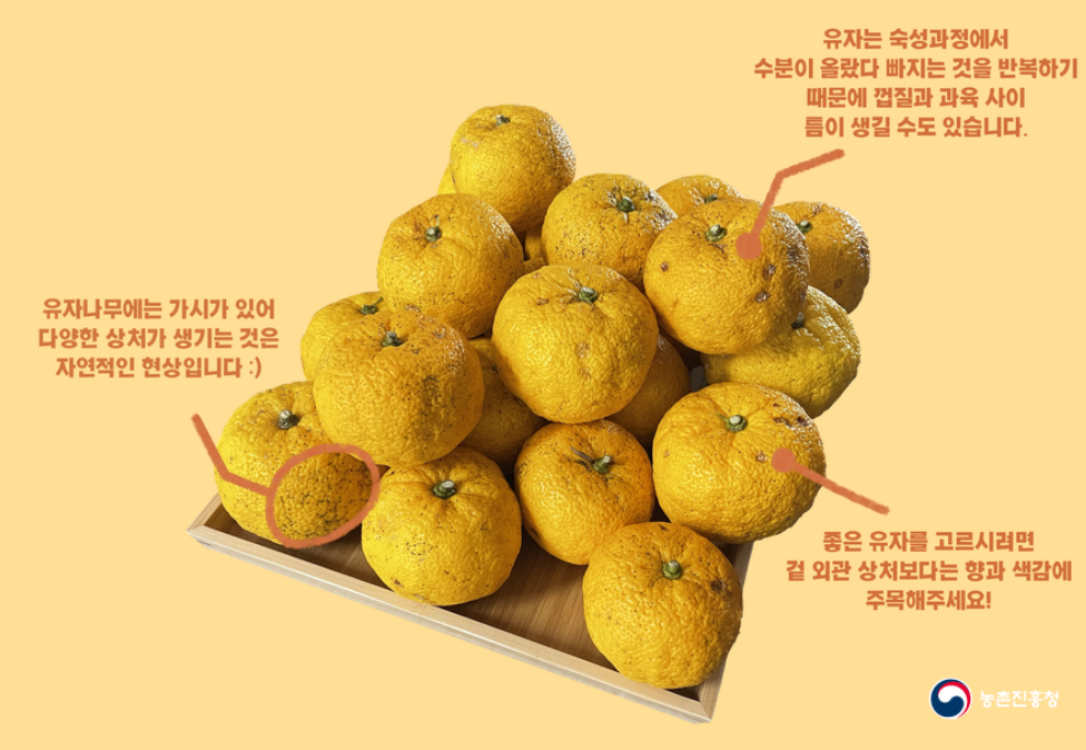유자나무에는 가시가 달려있어 자라면서 바람이 흔들리면 가시에 찔려 검은 점, 옹이와 같은 상처가 나곤 합니다. 미관상으로 좋진 않으나 과실 자체치유과정에서 폴리페놀 성분이 나와 건강에는 오히려 유용하다고 합니다. 유자는 숙성되는 과정에서 수분이 올랐다 빠지는 것이 반복되면서 껍질이 단단하고 울퉁불퉁해지며, 껍질이 다 자란 후 속 과일이 자라기 때문에 과실과 껍질 사이에 공간이 생길 수도 있다고 합니다. 또한 직접 씨앗부터 기른 실생목이 다른 나무에 접목시켜 자란 유자들보다 단맛도 크기도 뛰어나다고 합니다.