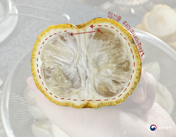 2. 깨끗이 닦아 겉의 물기를 제거한 유자는 꼭지를 따고 반으로 잘라 씨앗을 제거해 줍니다.