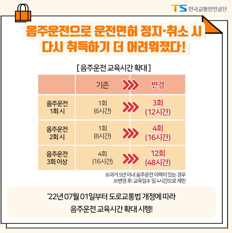 2022년 7월 1일부터 도로교통법 개정에 따라 음주운전 교육시간 확대 시행!