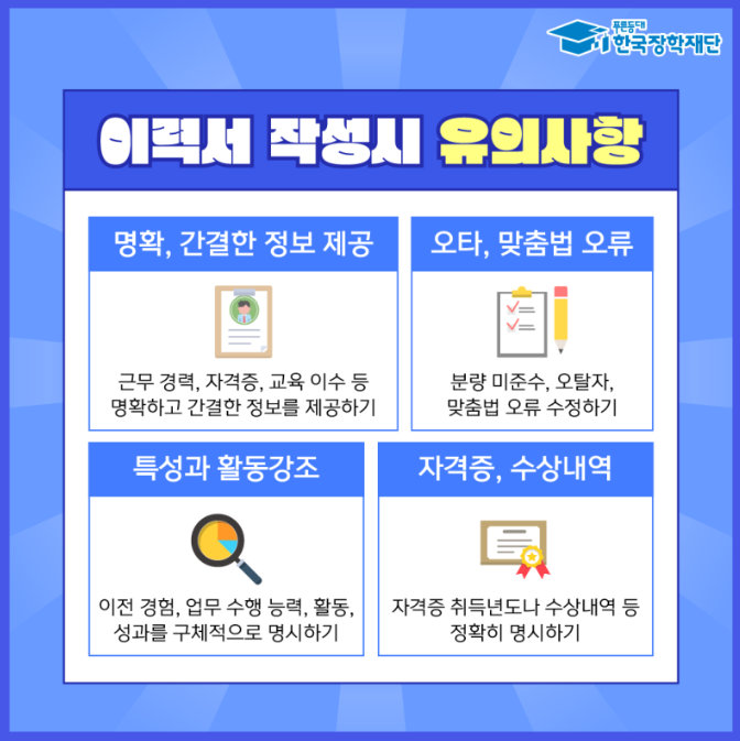 - 이력서 작성 시 오타나 맞춤법 오류를 방지해야 하며, 이력서에 포함된 모든 정보를 검토해야 합니다.