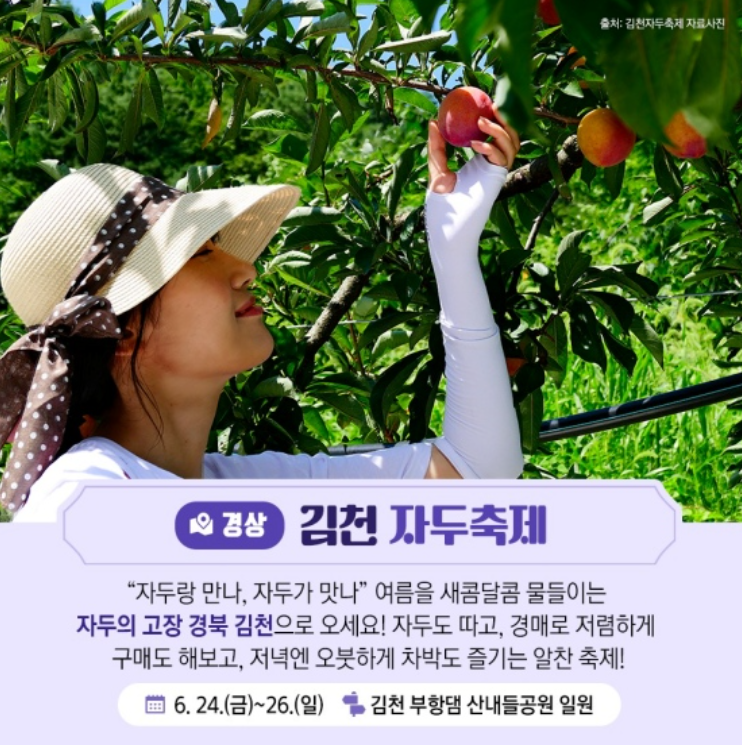 "자두랑 만나, 자두가 맛나" 여름을 새콤달콤 물들이는 자두의 고장 경북 김천으로 오세요! 자두도 따고, 경매로 저렴하게 구매도 해보고, 저녁엔 오븟하게 차박도 즐기는 알찬 축제!