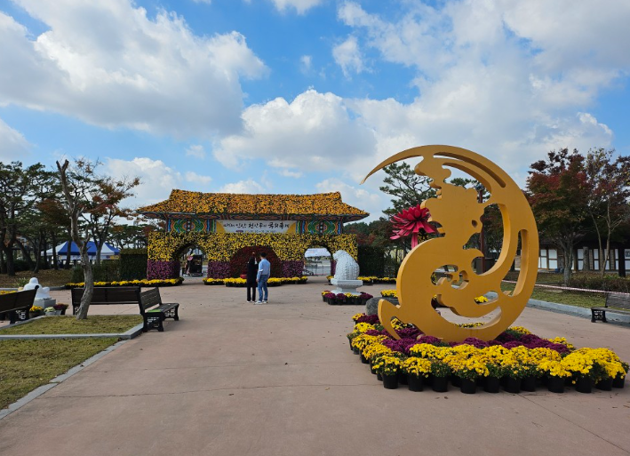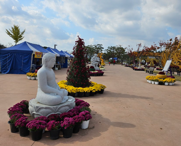 미륵사지 광장에서는 익산 천만 송이 국화축제가 분산 개최되고 있습니다. 미륵사지 광장의 국화축제장에서는 미륵사지와 미륵사지 석탑을 낳은 한 익산 이사달 후예들의 석 조각품 야외 전시회 제3회 2023 돌빛 축제 정·소리가 개최되고 있으며 미륵사지를 빛내주고 있었습니다.
