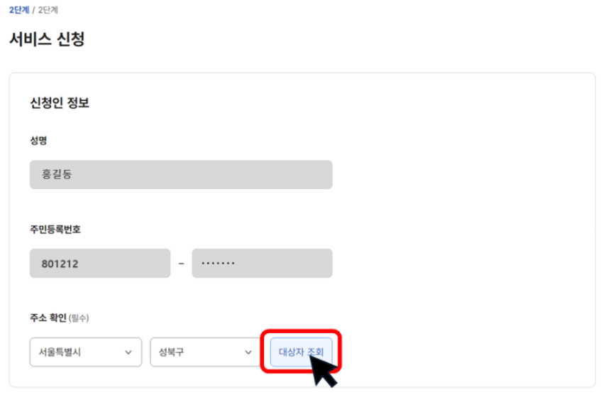 ② 주민등록 상 거주지 주소를 선택하신 후 대상자 조회를 클릭합니다.