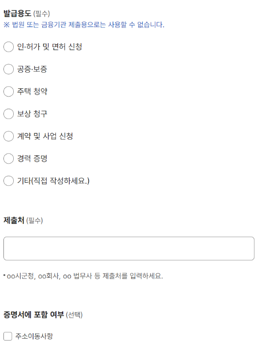 ④ 발급 용도, 제출처 등 추가 내용을 입력합니다.