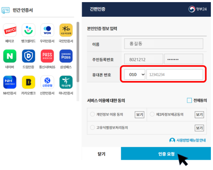 간편(민간) 인증으로 로그인하지 않은 경우, 휴대폰 번호 인증을 통해 휴대폰 번호를 입력하게 됩니다.