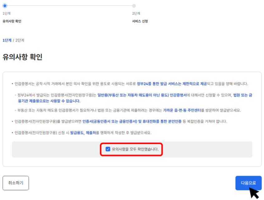 ② 유의사항 확인이 완료되었다면 체크를 하신 후, 다음으로 버튼을 클릭합니다.
