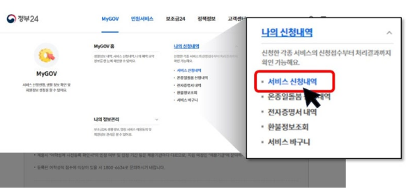 ① 상단 메뉴에서 'MyGOV > 나의 신청내역 > 서비스 신청내역'을 선택합니다.