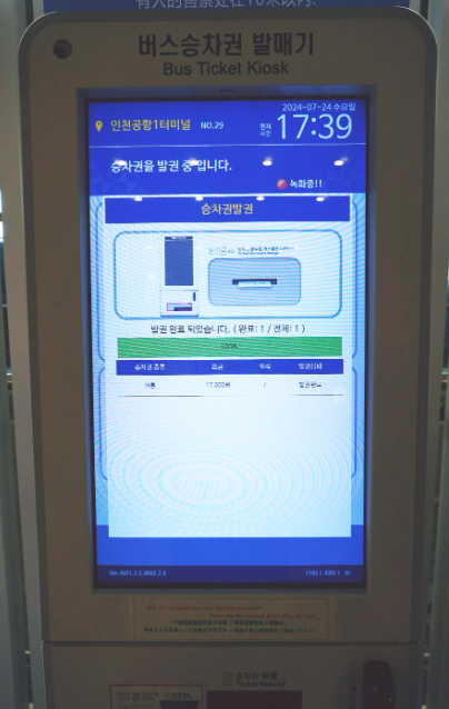 모든 과정이 완료되면, 이렇게 목적지와 버스요금, 탑승 시간, 탑승 위치 등이 기재된 버스표가 발권됩니다.