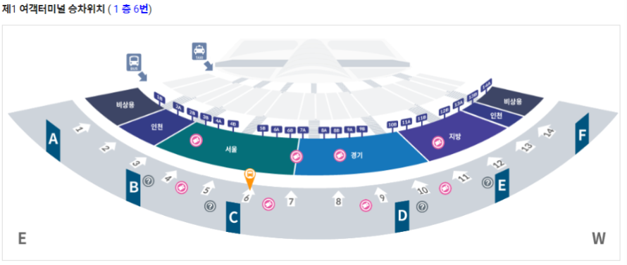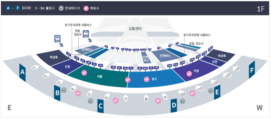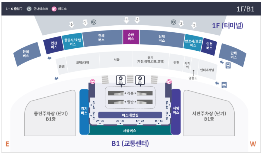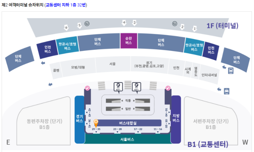 서울, 경기, 지방버스는 지하 1층에서 탑승하시면 되고, 단체버스, 인천버스, 항공/호텔버스 등은 1층에서 탑승하시면 됩니다.