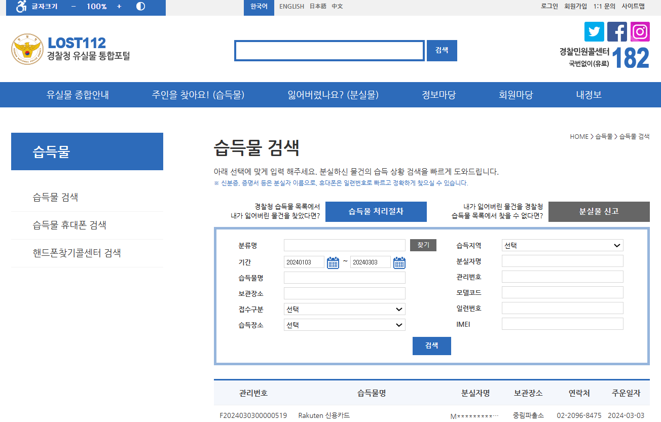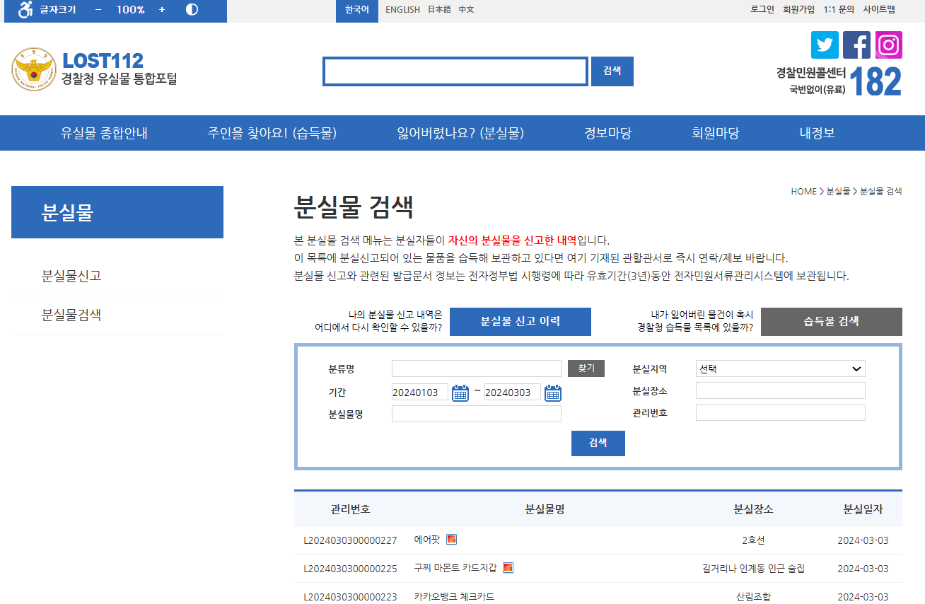 ✔ LOST112(경찰청 유실물 통합포털) 분실물 검색 화면