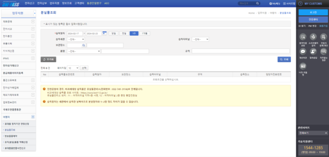 ✔ 유니패스(관세청) 여행자 분실물 검색 화면