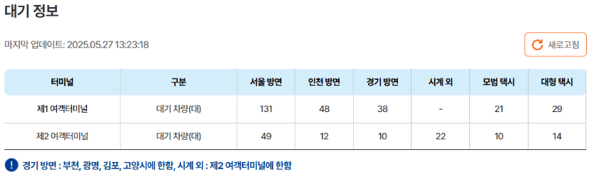인천공항 홈페이지 > 교통·주차 > 대중교통 > 택시/콜밴에 들어가시면 실시간 대기 중인 차량 정보를 확인할 수 있습니다.