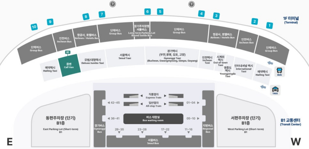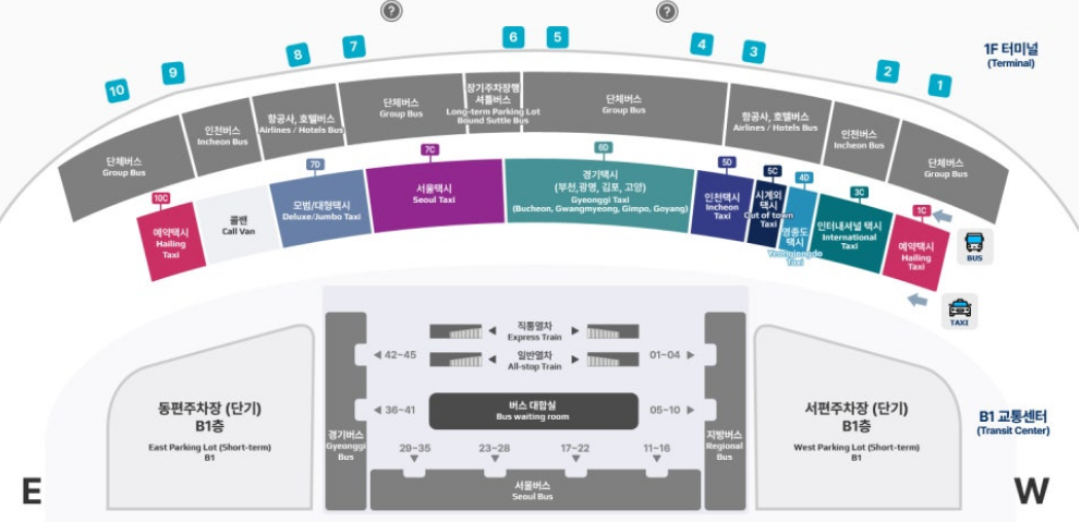 도착지역에 따라 승차장 위치가 다르니, 아래 이미지를 확인하시면 됩니다.