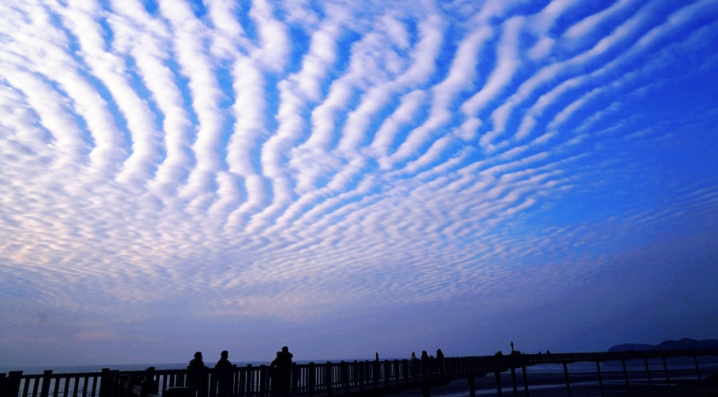 이날 흐린 하늘이 맑아지는 듯하면서 하늘에는 구름이 밭이랑처럼 펼쳐지며 일명 지진운이라는 구름을 볼 수 있었는데, 해가 지는 시간 잠깐 하늘 쇼를 보여주듯이 물 빠진 바닷가 갯벌 모습 그대로 하늘에서 펼쳐지는 현상이 신기했습니다.