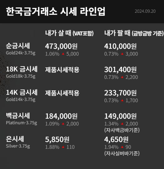내가 팔때는 24K금시세 기준 3.75g당 전날 마감 시세보다 3,000원 상승한 410,000원이며, 18K금시세 기준 3.75g당 전날 마감 시세보다 2,200원 상승한 301,400원이며, 14K 금시세 기준 3.75g당 전날 마감 시세보다 1,700원 상승한 233,700원이라고 합니다.