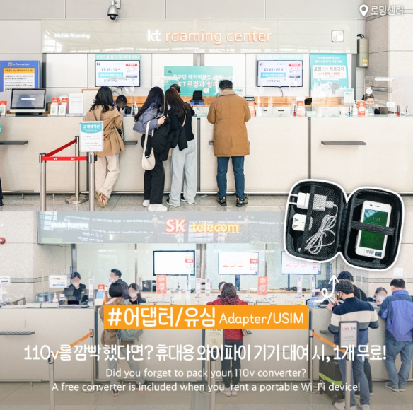 자신의 통신사 및 요금에 따라 로밍 무료 이용 등의 추가 혜택도 있습니다. 일본여행 떠나기 전 본인의 요금제를 확인해봐야 합니다. 더불어 해당 로밍센터에서 기기를 대여하면 충전에 필요한 110V 어댑터도 덤으로 대여해 줍니다. 사용 후, 인천공항 1층 도착층 내 24시간 운영되는 로밍센터에 간편하게 반납할 수 있습니다.