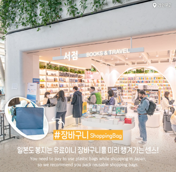 인천공항 제1여객터미널 3층 일반지역 H체크인카운터 부근으로 가면 경인문고가 있습니다. 주로 도소, 신문, 잡지 등 이동 중에 보기 좋은 것들을 판매하는데, 가볍고 휴대하기 편한 장바구니를 같이 판매하고 있으니, 쇼핑을 즐길 분들이라면 구매하는 것을 추천드립니다. 일본을 돌아다닐 때 가벼운 물건들을 넣어두고 에코백처럼 사용하기도 좋습니다.