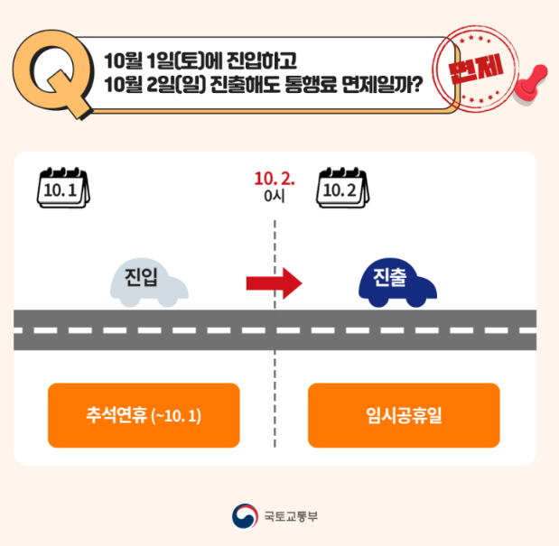 10월 1일(토)에 진입하고 10월 2일(일) 진출해도 통행료 면제일까?
