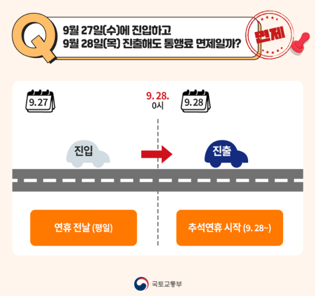 9월 27일(수)에 진입하고 9월 28일(목) 진출해도 통행료 면제일까?