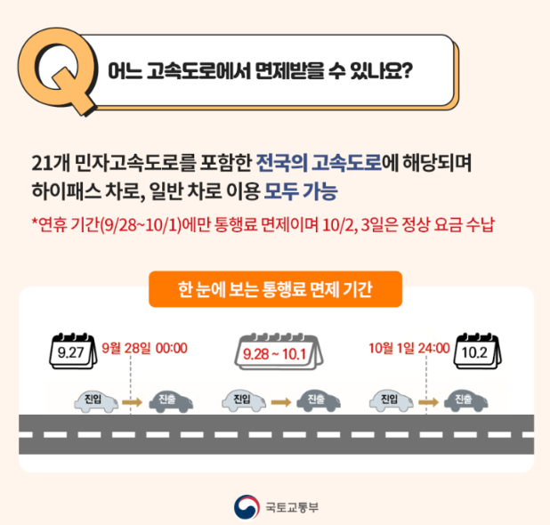 ※ 연휴 기간(9/28~10/1)에만 통행료 면제이며 10/2, 3일은 정상 요금 수납