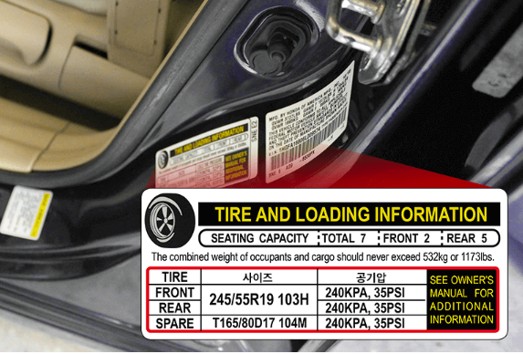 평소에 주의깊게 들여다보지 않은 이상 내 차의 적정 타이어공기압을 알고 있는 운전자는 두물 것입니다. 내 차의 타이어 공기압이 궁금하다면 운전석 도어 안쪽에 부착된 스티커를 보고 확인할 수 있습니다. (또는 차량 매뉴얼을 확인해 주면 됩니다. 겨울철에는 타이어 공기압이 자연스레 낮아지기 때문에 미리 공기압이 낮아질 것을 대비하여 권장 공기압보다 10% 정도 더 높게 넣어주는 것도 좋은 방법입니다.