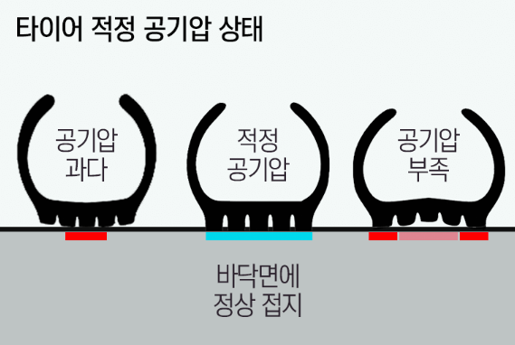 타이어의 공기압이 높거나 낮으면 바닥면에 정상적으로 접지하는 타이어의 면적이 달라지게 됩니다.