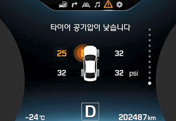 비교적 최근에 나온 차량은 계기판에 TPMS경고등이 점등됨과 함께 '타이어 공기압이 낮습니다'라고 직접적으로 알려줍니다. 낮아진 공기압의 위치와 공기압 단위까지 알려주어 운전자가 직관적으로 문제를 인식할 수 있습니다.