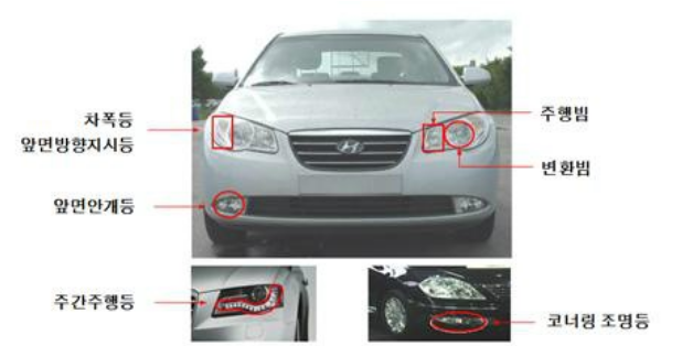 자동차에 장착되고 있는 등화장치는 크게 두 가지 형태로 크게 분류할 수 있는데, 첫 번째로 야간운전 시 도로를 비추는 조명용 등화장치인 전조등, 앞면안개등, 코너링 조명증, 후퇴등이 있습니다. 그리고 두 번째로 자동차의 방향전환, 정지(브레이크) 등과 같은 신호 제공 또는 위치를 알려주는 등화장치인 후미등, 제동등, 보조제동등, 차폭등, 방향지시등, 주간주행등, 번호등, 후부반사기, 후부반사판, 반사띠, 뒷면안개등, 바닥조명등 등이 있습니다. 현재 20여 종의 등화장치가 자동차 종류에 따라 사용되고 있으며, 등화장치는 개수, 빛의 세기, 색상(컬러), 장착위치 및 크기 그리고 작동조건에 따라 설치되고 작동되어야 합니다.