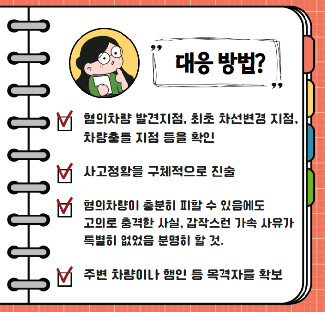 먼저 사고 전, 사고 당시, 사고 후 차량 위치 등을 현장에 표시하고 사고 현장과 차량의 상태 등을 사진 촬영해야 합니다. 그리고 경찰관과 보험회사 직원에게 혐의 차량이 충분히 피할 수 있음에도 고의로 충격한 사실 등 사고 정황을 구체적으로 진술하여, 혐의 차량의 갑작스러운 가속 사유가 특별히 없었음을 명확하게 이야기해야 합니다. 사고 시 주변 차량이나 행인 등 목격자를 확보하는 것도 큰 도움이 될 수 있습니다.