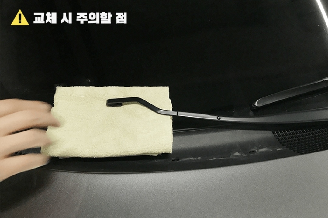 교체 시 주의할 점! 와이퍼 교체 시 유리에 수건을 덧대어 주고 기존 와이퍼를 제거한 후 꼭 세워뒀던 와이퍼암을 내려줍니다. 와이퍼암이 실수로 확 접히면 앞 유리를 강타하여 자칫 유리가 깨질 수도 있습니다.