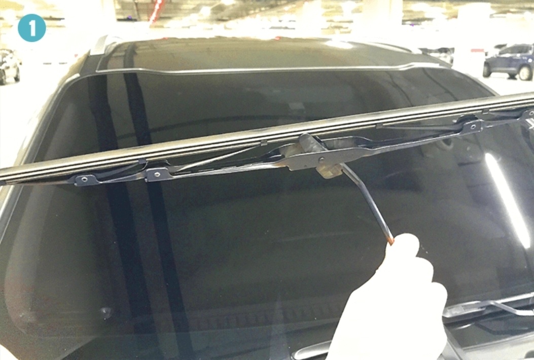 ① 와이퍼를 세운 후, 와이퍼를 젖혀 줍니다. 사진 속 와이퍼는 커버가 없는 제품입니다. 제품별로 커버가 있는 제품도 있고, 없는 제품도 있습니다.