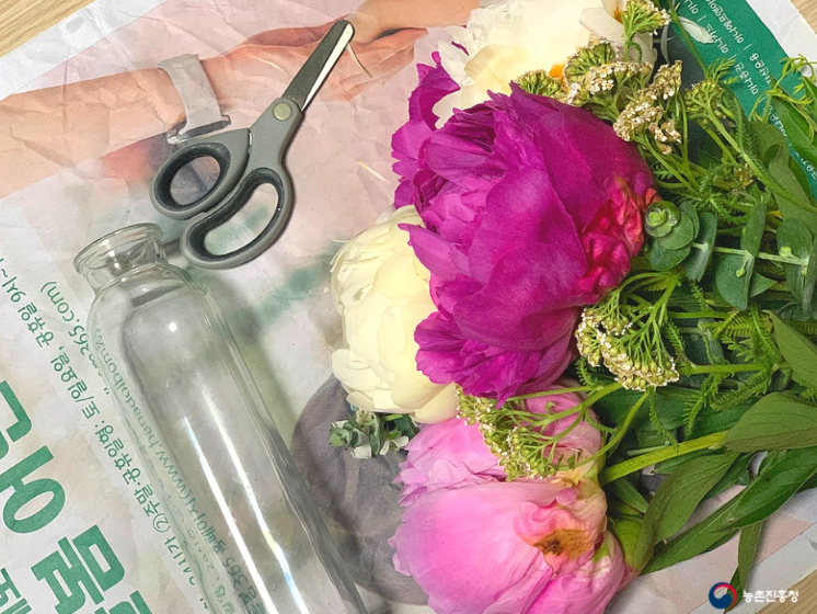 작약(4~5송이), 유칼립투스(1가지), 톱풀(4~6가지), 가위(1개), 화병( 1개)