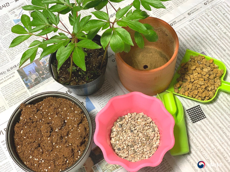 작약 모종(12cm, 포트 1개), 화분(지름 15~18cm, 1개), 상토(약 3L), 거름망(3~4cm, 1개), 난석(200g), 마사토(300g), 편의에 따라 미니샵 등의 식재도구 준비(일회용 숟가락 추천)