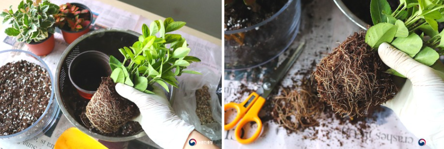Tip : 식물의 뿌리가 길게 발달되어 있을 경우, 식재 높이를 기준으로 적당한 길이로 잘라 정리해 주고 사용할 만큼 포기를 나눠줘도 좋습니다.