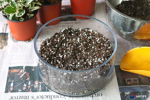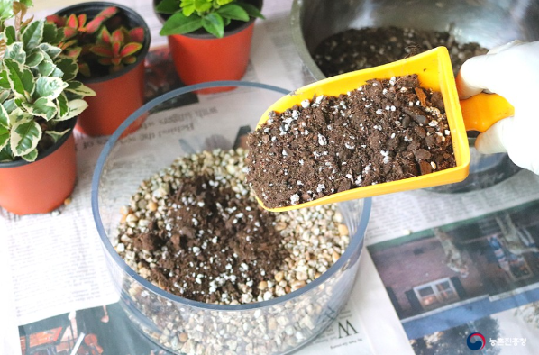 3. 마사토에 식물 뿌리가 닿지 않도록 배양토를 경계로 용기의 1/2 높이까지 담아줍니다.
